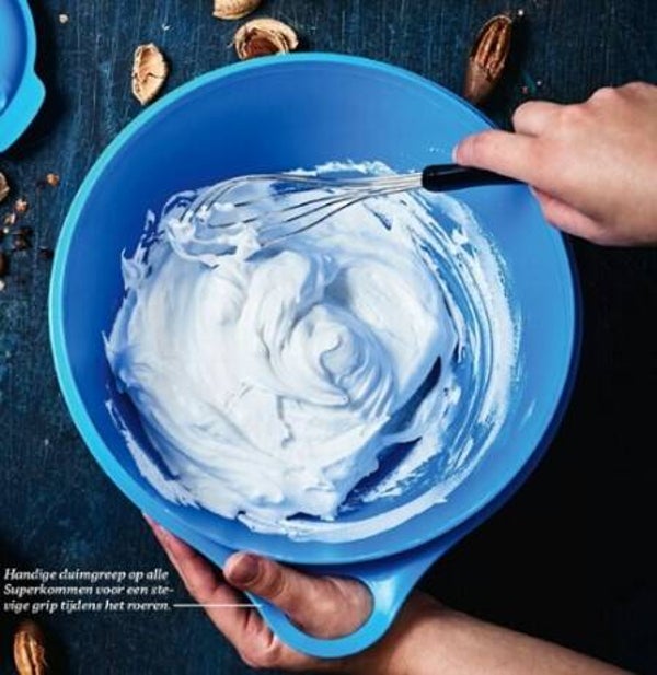 - Tip: greep met een opening om de kom met de duim in bedwang te houden tijdens het mengen of serveren.