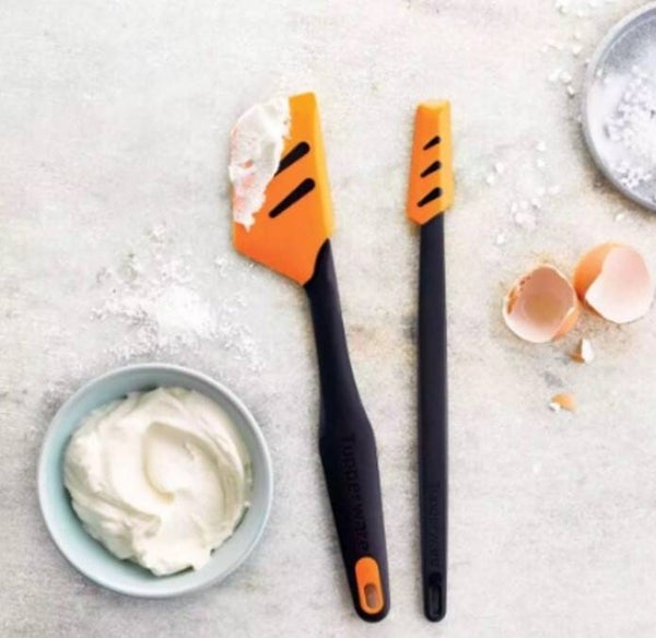Met de slijtvaste en veelzijdige Tupperware Silicone Spatel meng je in een handomdraai al je natte en droge ingrediënten zonder onnodige weerstand! Hij is perfect voor elke bereiding – zelfs voor delicate recepten, zoals macarons of taarten. De spatel is een sterke, maar comfortabel aanvoelende must-have met een afgeronde en een rechte hoek. Ideaal om saus en beslag te mengen in al je kommen, potten of pannen, welke vorm ze ook hebben, maar ook om resterende etenswaren uit je kommen te schrapen. De kop heeft twee zijden: de ene is ideaal om rechte wanden schoon te schrapen, de andere bereikt elk hoekje van je mengkommen of schalen. Heb je de spatel even niet nodig, dan hang je hem op aan het handige oogje aan het uiteinde.