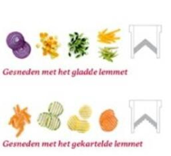 Dankzij de schuine plaatsing van de messen glijden de ingrediënten over de snijrand en raken ze veel minder snel beschadigd.