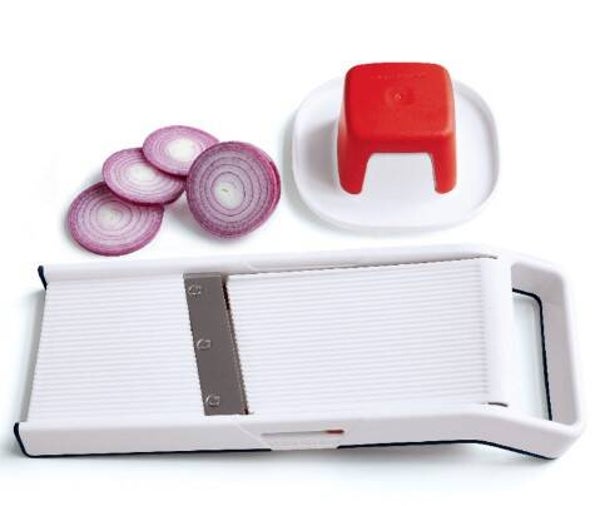 De kleine groenteschaaf met drie verschillende diktes. Snel en veilig De Mando Junior heeft een vlijmscherp mes, en door de plaatsing en vorm snijdt het bijzonder goed. 'Snel' en 'vlijmscherp' zijn echter een heel gevaarlijke combinatie. De duwer is hier de sleutel tot veilig werken.