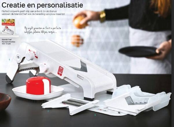Snijden als een echte chef. Gebruik de MandoChef om moeiteloos en zelfverzekerd al je ingrediënten in plakjes of stukjes te snijden. Met onze handige, hoogwaardige mandoline bereid je salades, slaatjes, aardappelgerechten en nog veel meer aan een duizelingwekkend tempo.