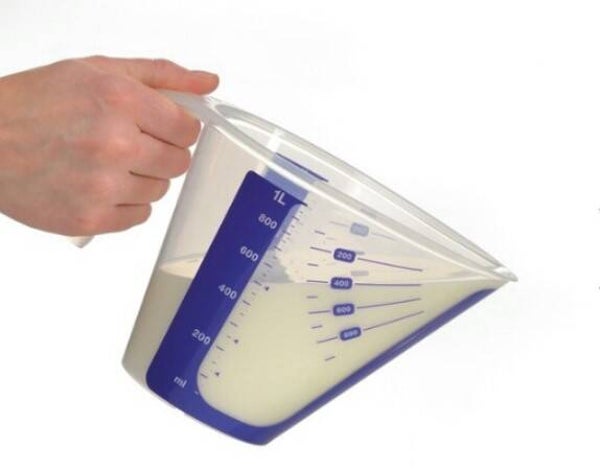 Tupperware Maatbeker heeft drie-dimentsionale maataanduiding: a) traditionele wijze - aan de zijkant, b) tijdens invullen: aan de binnenkant en c) schuin zijkant: om te meten tijdens uitgieten.
